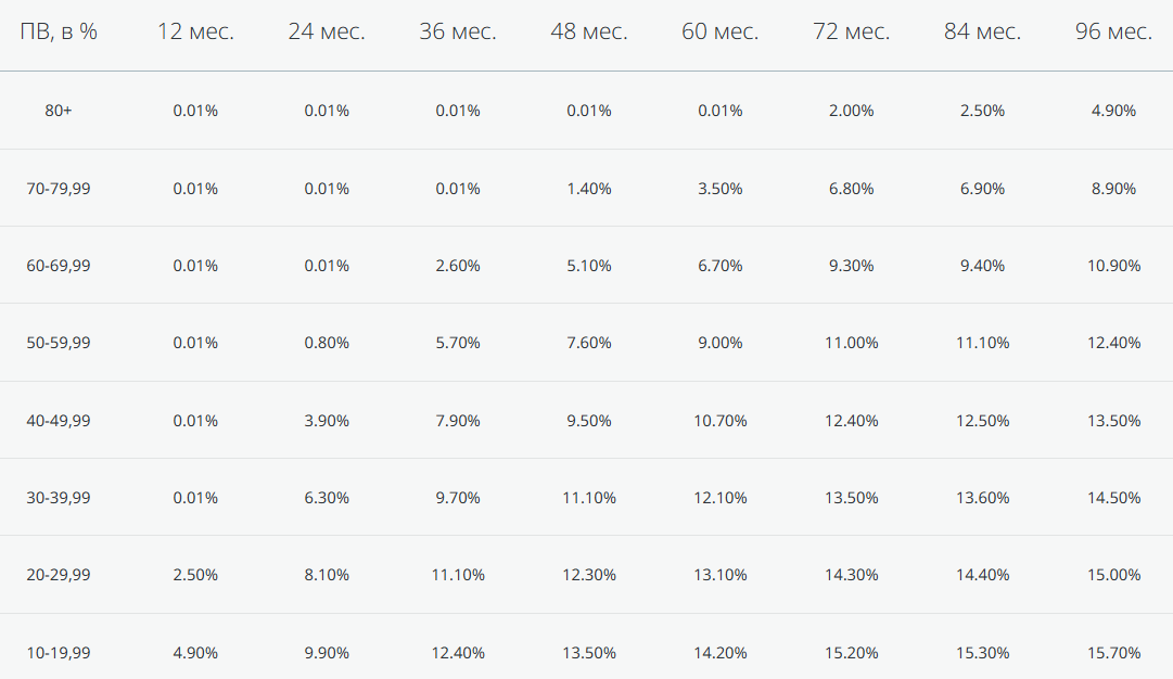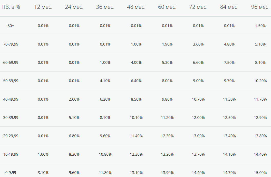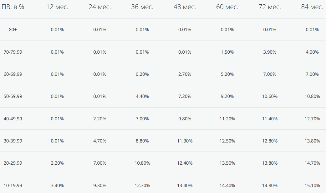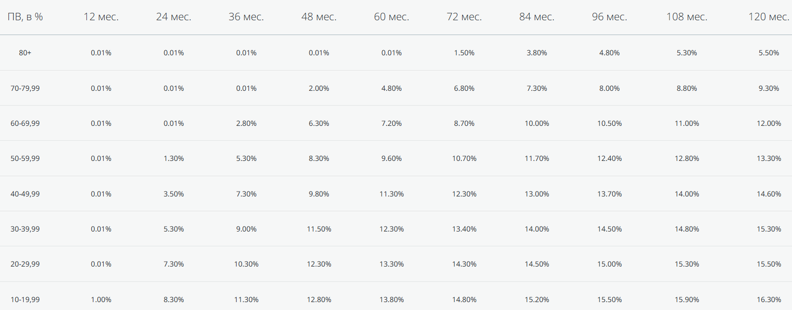 - При сроке 36 месяцев: ставка 0,01% годовых при первоначальном взносе от 70%.