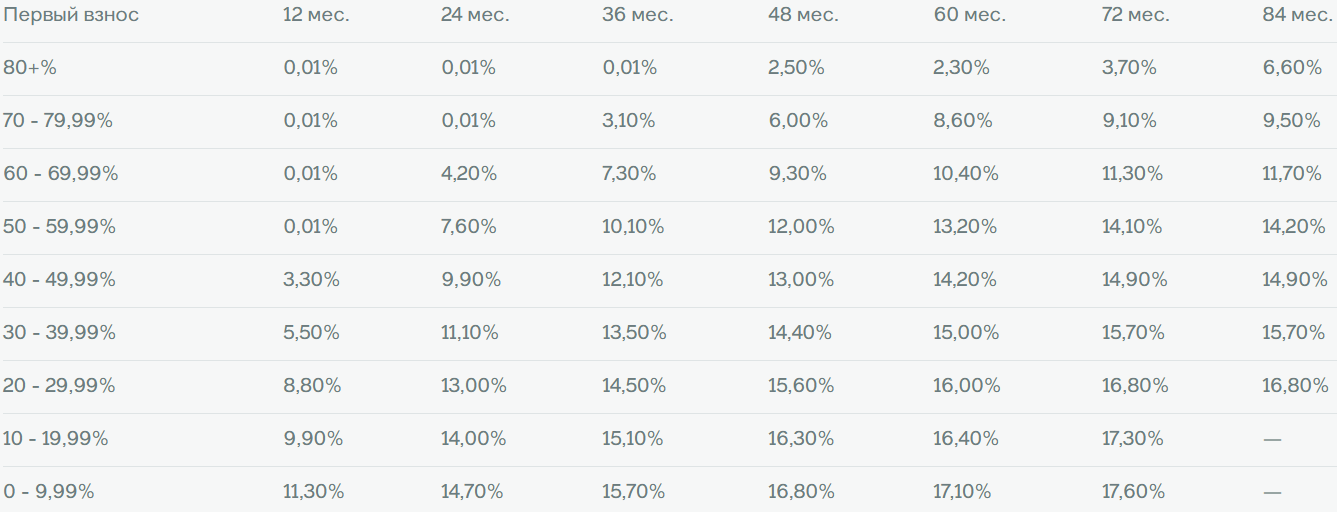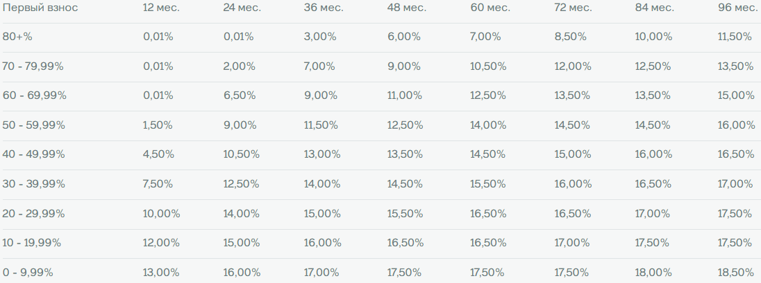 - При сроке 24 месяца: ставка 0,01% годовых при первоначальном взносе от 70%.