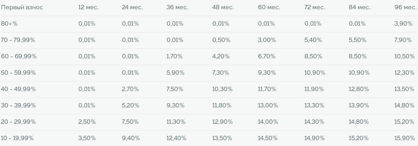 Диапазон Полной стоимости кредита в % годовых составляет от 0,005% до 16,385%. % ставка составляет от 0,010% до 15,900%, на диапазонах первоначального взноса от 10,000% до 90,000% включительно от стоимости автомобиля, при сроке кредита от 12 до 96 мес. и определяется индивидуально.