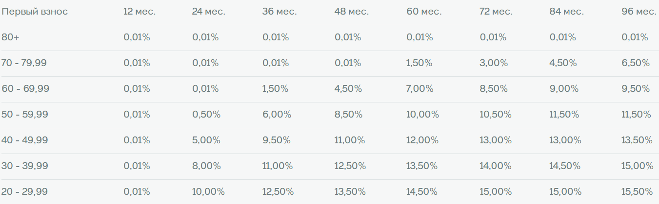 - При сроке 12 месяцев: ставка 0,01% годовых при первоначальном взносе от 20%.