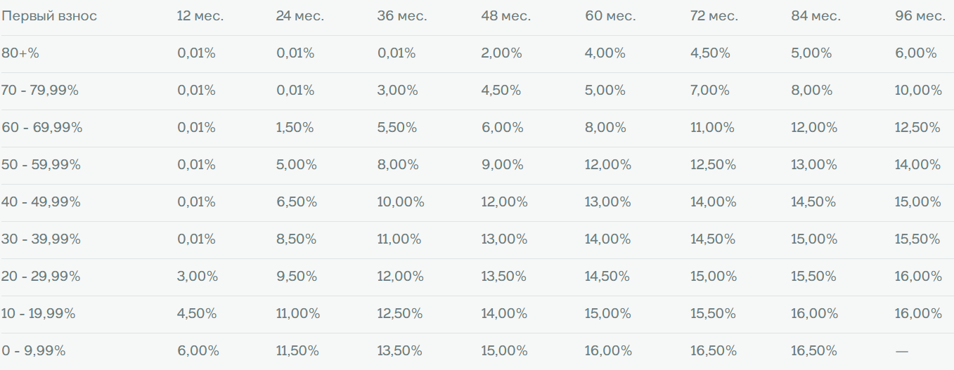 - При сроке 12 месяцев: ставка 0,01% годовых при первоначальном взносе от 30%.