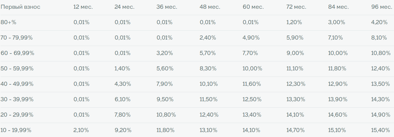 - При сроке 24 месяца: ставка 0,01% годовых при первоначальном взносе от 60%.
